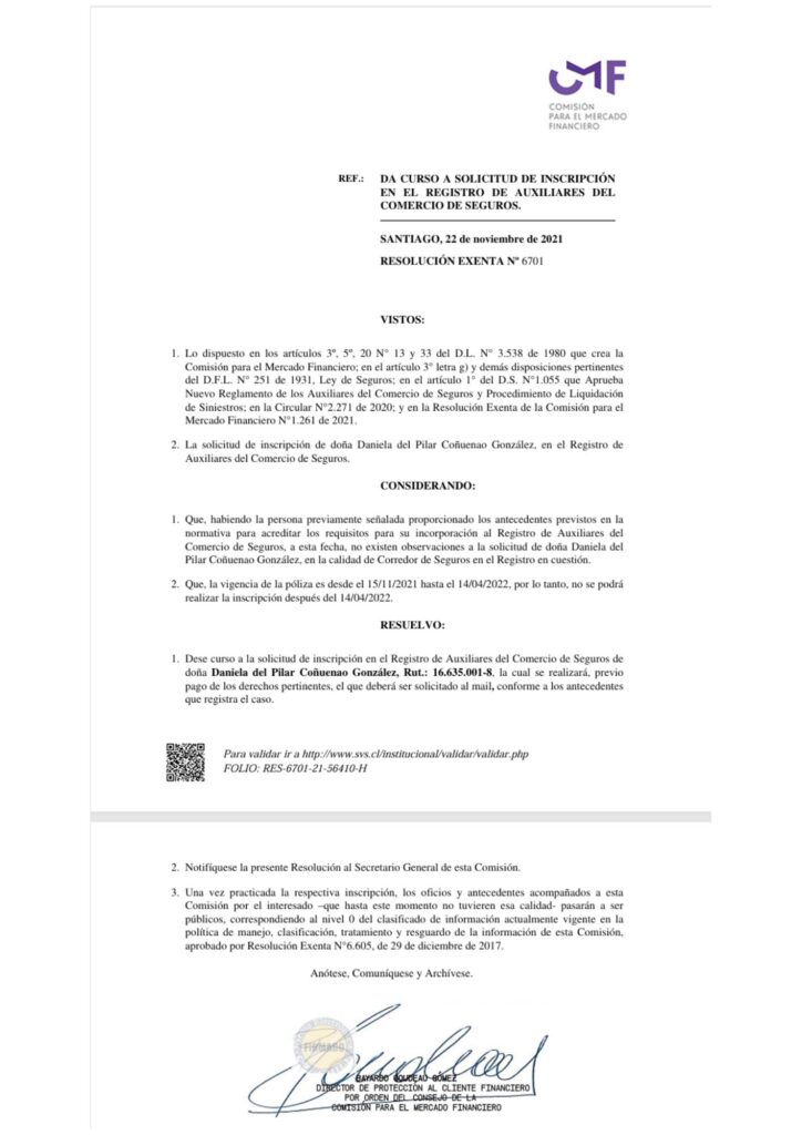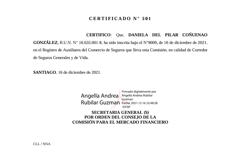 - Aprobó las evaluaciones exigidas por la Comisión para el Mercado Financiero (CMF) para ejercer como corredor de seguros en Chile.